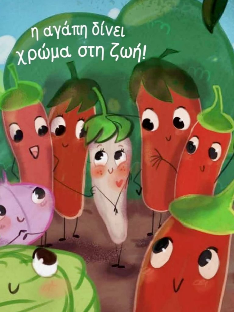 The Florina peppers from Afroula Berea’s fairy tale “A pepper of special beauty”, from Sofia publications, became PuPo dolls! Illustration by Vivi Markatou. Summer came and the garden was filled with colorful vegetables. Among them, a small white pepper appeared. But it was so different that it could not be accepted by the others. And so she decides to find a solution, so that she too can blush!