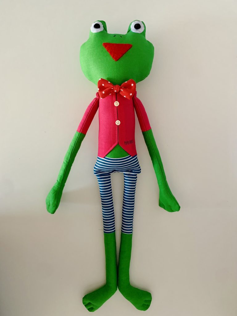 The hero Max from Zoe Theodosiadis’ fairy tale “The Lazy Frog”, from Ocelotos Publications, became a PuPo doll! Illustration by Emmanuella Kakavia. The frogs had snuggled up in their blankets and after a great effort they managed to fall asleep. The sky split in two from the lightning, the wind blew very hard, the house began to creak and the fence was torn apart. The rain lashed the trees, cut branches fell and covered the swamp…They get up from their beds in fear. They try to resist the fierce wind, which comes in through cracks, until its force lifts them into the air, whirling them around…A story about Max’s adventures and sufferings from which young readers will understand how important family is.
